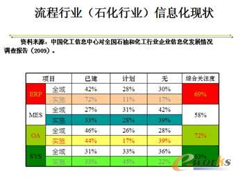 這個(gè)數(shù)據(jù)是來(lái)源于我們的行業(yè)協(xié)會(huì)提供的一個(gè)數(shù)據(jù)。相對(duì)來(lái)說(shuō),流程行業(yè)一般企業(yè)規(guī)模都比較大,信息化的基礎(chǔ)相對(duì)比較好,走在其他行業(yè)的前列,通過(guò)表格可以看到,流程行業(yè)已經(jīng)應(yīng)用了哪些系統(tǒng)。在當(dāng)今無(wú)論是ERP還是大家剛才介紹的生產(chǎn)管理控制系統(tǒng),這些在流程行業(yè)都有深入的應(yīng)用。從圖上還能看到截止到2009年底流程行業(yè)的總的態(tài)勢(shì)和水平,已不僅僅滿足于簡(jiǎn)單的財(cái)務(wù)這樣一個(gè)應(yīng)用。