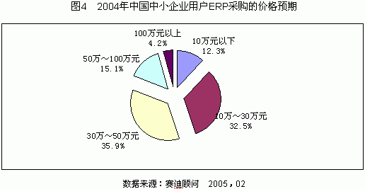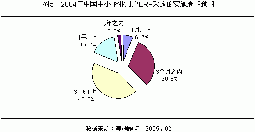 賽迪顧問2004年中小企業(yè)采購行為研究表明,有68.4%的中小企業(yè)用戶可以接受價位在10萬~50萬元的ERP產(chǎn)品,僅有4.2%的用戶能夠接受百萬元以上的ERP產(chǎn)品。有43.5%的中小企業(yè)用戶希望ERP項目的實施周期能夠控制在3~6個月之內(nèi),僅有2.3%的用戶能夠接受實施周期在一年以上的ERP產(chǎn)品。2004年中國中小企業(yè)用戶對ERP軟件產(chǎn)品的預(yù)期價格和實施周期如圖4、圖5所示。