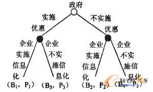 (4)信息集:政府只有一個信息集,兩個可供選擇的行動。其信息集為:S1=(實施,不實施);而企業有兩個信息集,每個信息集上有兩個可選擇的行動,因而共有四個戰略決策。其信息集為:S2={(信息化,信息化),(信息化,非信息化),(非信息化,信息化),(非信息化。非信息化)};