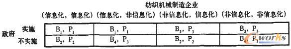 在推進信息化建設的過程中,各方經濟主體都要隨情況變化采取不同應對措施,以保障自身獲取最優利益。紡織機械制造企業信息化也是以利潤最大化為主導原則,只有經過成本效益分析而且有利時,企業才能主動引用信息技術。而政府作為信息化建設的推動者不僅要考慮國家的整體利益,同時也要兼顧企業的利益。因此,紡織機械制造業信息化就是政府和企業不斷進行博弈選擇,不斷推進的過程。
