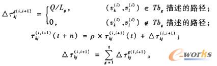 其中,△Tki(i)為本次遍歷后螞蟻在Vk(i)和Vt(i)之間的路徑上留下信息素增量的和;△Tkl(i)為從t到t+n時刻第g只螞蟻在以Vk(i)和Vi(i)路徑之間留下的信息素的增量,它的結(jié)果可由下面的方程式求出: