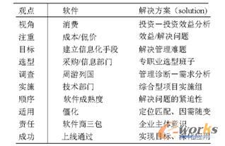 我們看到不同企業在實施ERP的過程中,有各種完全不同的做法,并由此產生絕然不同的效果,究其根本原因,就是把ERP的實質理解為軟件還是解決方案。不同理解造成不同做法,請見下表: