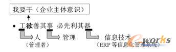這里“工”就是管理者,“欲”就是管理者有把管理搞上去、提高企業競爭力的強烈欲望,簡言之,“工欲”就是“我要干”,也就是我們常說的“企業主體意識”。如果企業的決策者和管理者沒有改進管理的欲望,再好的ERP產品也不可能發揮作用。因此,千萬不能忽視“工”字,也就是“人的因素”,和“欲”字,也就是上ERP的動因。