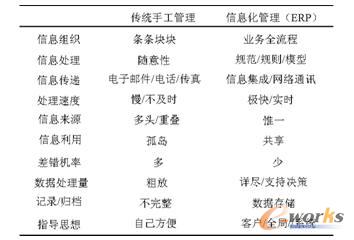 信息化管理決不是手工管理的翻版,它們是兩種不同的管理模式;它們之間的區別可以用下表說明。