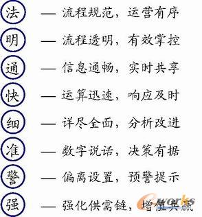 借助信息技術(shù)的支持,信息化管理(如ERP)具備許多手工管理無(wú)法做到的功能特點(diǎn),可以用8個(gè)字概括,即:法、明、通、快、細(xì)、準(zhǔn)、警、強(qiáng),簡(jiǎn)要說(shuō)明如下。