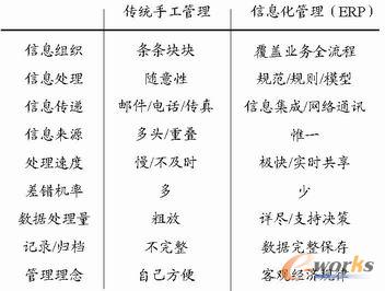 信息化管理決不是手工管理的翻版,它們是兩種不同的管理模式;它們之間的區(qū)別可以用下表說(shuō)明。