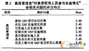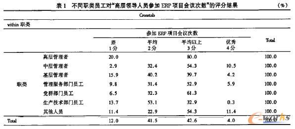 從表1中可以看出,不同職類員工對“高層領導人員參加ERP項目會議次數行這個問題的評分各不相同,比如高層管理者中有20%的人打了1分,即%的人打了3分,而中層管理者中僅有2.9%的人打了1分,還有10.5%的人認為優秀。
