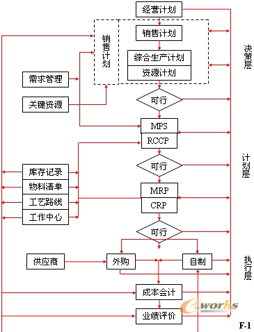 F-1是MRPⅡ邏輯流程圖。RCCP和CRP是完成時間計劃的主要環節。它的處理思路是: