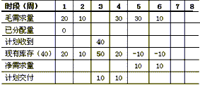 以上計算過程表明雖然1,2,4,6周均需要A,但實際A只要3及4周交付10個即可以了。這個計劃下達時間和數量就是部件B和C的毛需求的時間和數量。