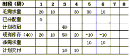 表1 產品A的需求量計算(產品A,提前期=2,批量=10)