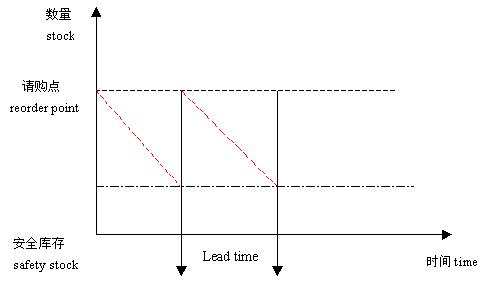 請購點由安全庫存(safetystock)和在正常情況下物料補給時間內(leadtime)所需要的消耗量之和(consumption)組成.因此,當決定一種物料的請購點時,必須考慮安全庫存和物料補給期間內的消耗量,也就是說,安全庫存和請購點的控制是定點請購法的核心參數