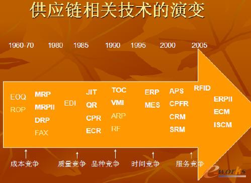 從歷史上來講,供應(yīng)鏈一些相關(guān)技術(shù)在不斷演變,隨著我們企業(yè)競爭焦點不斷的演變,技術(shù)也發(fā)生一些改變。早期60、70年代我們叫基于成本的競爭,這個時候更多從庫存降低成本角度,所以當(dāng)時庫存EOQ、ROP經(jīng)典庫存管理,后來演變成DRP,制造資源計劃等等,這些都是在70、80年代就發(fā)展出來。后來就是EDI技術(shù),到了80年代叫質(zhì)量競爭的時代,日本的企業(yè)風(fēng)靡全球有一個GIT,就是“四化”生產(chǎn),現(xiàn)在叫精益生產(chǎn)或者精細(xì)生產(chǎn)。還有供應(yīng)鏈Q(jìng)R快速反應(yīng),CPR就是快速補給系統(tǒng),ECR有效客戶響應(yīng),也是在那個時候發(fā)展起來的。
