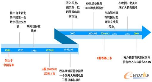 中興通訊創立于1985年,到現在快25年的時間,公司1997年在深圳上市,2004年在香港H股上市,其中海外第一個大規模訂單是1998年在巴基斯坦獲得的大規模電信工程總承包項目,2002年開始進入印度、俄羅斯、巴西等國家的市場,2006年在歐洲和北美區域擴大銷售規模,銷售額大增,2007年海外銷售業務收入首次超過國內。