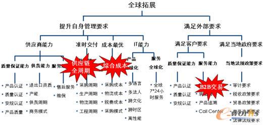 中興通訊在全球拓展環境下,面對企業供應鏈要求,從兩方面著手,一是內部提升自身管理要求,二是滿足外部要求。內部提升包括四個方面:一是供應商管理,包括對供應商能力認證的要求;二是準時交付的要求;三是成本最優化的要求;四是IT方面的要求。滿足外部方面主要包括滿足客戶要求和滿足當地政府要求。