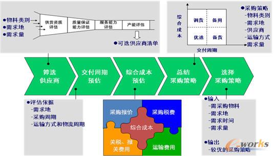 采購策略制定包括5個部分:篩選供應商、交付周期預估、綜合成本預估、總結采購策略、根據實際要采購的東西,從備用采購策略選擇比較優的采購策略。