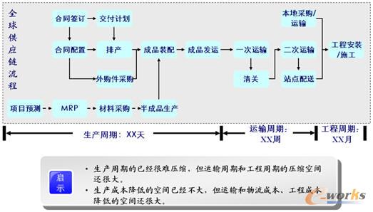 從目前企業管理來說,企業對內部生產關注度非常高,周期壓縮空間已經非常小,都以天為單位。而運輸周期和工程周期以周和月為單位,壓縮空間非常大,但是目前對這塊考慮的非常少。再就是成本降低,生產成本降低空間已經不大了,很多生產都采用外協生產,比如外包給富士康生產。但是運輸成本降低和物流成本降低的空間還是很大。所以我們考慮周期壓縮和成本降低時,要考慮整個周期怎么壓縮,整個成本怎么降低。
