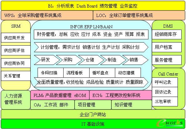 ERP系統,自2002年底開始上線以來,不斷深化應用,已經覆蓋了全部主要業務方面,包括研發、采購、倉儲、制造、質量、銷售、財務和和售后服務等部門,并形成了以Infor ERP LN/BaaN系統為核心的全面信息化管理體系。