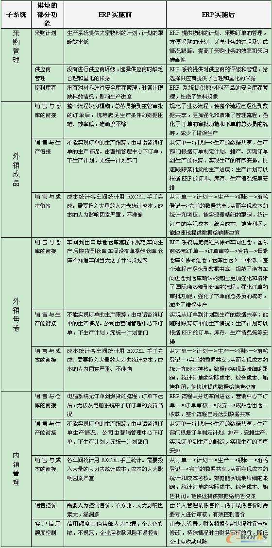 以下是永大各主要業務部門在實施ERP系統前后在管理上的對比: