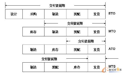 在《面向訂單生產企業的業務特點及管理難點》一文中,我們提到,企業常用的制造策略有:MTS(Make To Stock ,面向庫存生產)、ATO(Assembly To Order,面向訂單裝配)、MTO(Make To Order,面向訂單生產)和ETO(Engineering To Order,面向訂單設計)。采用不同的制造策略,對客戶訂單的交付提前期是不同的。對比關系見下圖: