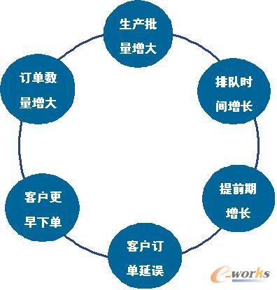 這個循環是:采用大批量生產—〉生產訂單在每個加工中心的排隊時間增長—〉生產提前期增長—〉客戶訂單無法按時交付—〉設置更長的標準制造提前期—〉客戶更早下單—〉訂單的數量更大—〉生產批量更大。這是一個惡性的循環。解決的方法是降低生產批量。