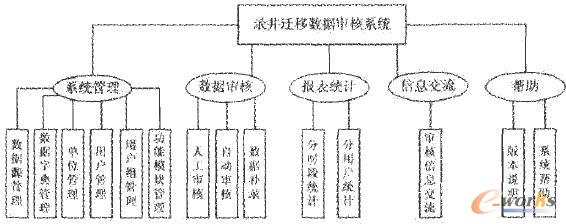 軟件功能模塊分為五大部分,系統管理、數據審核、報表統計、信息交流、系統幫助。系統管理實現與系統操作有關的數據源、數據字典、單位、用戶、用戶組、功能模塊授權等功能;數據審核部分是此系統的核心功能模塊,根據用戶需求,將數據審核分為人工審核、邏輯審核以及數據補錄三部分;具體的子功能模塊設計如下圖所示: