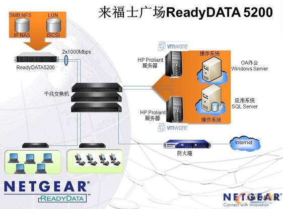 在來福士本地化的局域網絡中,虛擬化應用首先必須保證OA(Windows服務器)和業務數據(SQL數據庫服務器)兩套系統的正常運行,并且未來可按業務的需要隨時地增加。所以,NETGEAR基于現有的IP網絡基礎架構的存儲ReadyDATA 5200能為虛擬化應用提供高效的數據存儲。
