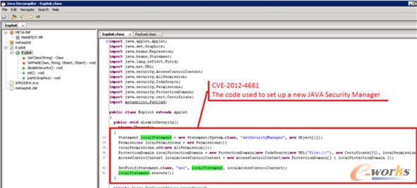 但是,當安全專家對這份可公開訪問的可疑PDF文檔進行內容搜索后,竟然沒有發現任何“inte1sat”的字樣。我們可以大膽猜測,該文檔在通過谷歌的OCR算法掃描或傳真后上傳到網絡時,OCR算法對英文字母“l”的識別產生了錯誤。盡管這個解釋不是不可能,但我們還是決定從一切的源頭展開調查,找出具體原因。Websense安全實驗室在圖形化環境下對先前“inte1sat.com”域名下的可疑Java包進行了進一步的分析,這時,專家們發現了其中被植入的CVE-2012-4681漏洞攻擊包。該攻擊包會不斷生成并拋出異常,以此劫持Java Security Manager類,并發動后續攻擊。(見圖4)