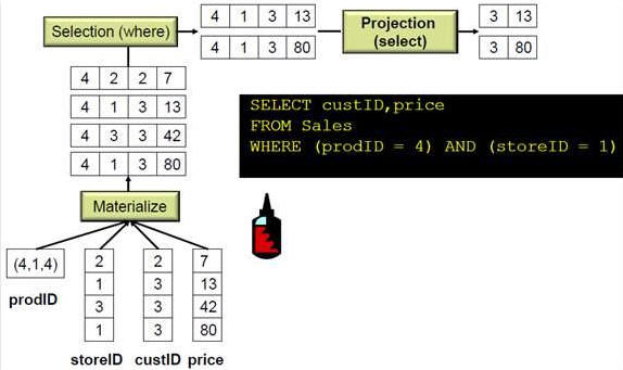傳統(tǒng)的行式數(shù)據(jù)庫運(yùn)算, 在運(yùn)算的一開始就解壓縮所有數(shù)據(jù),然后執(zhí)行后面的過濾,投影,連接,聚合操作