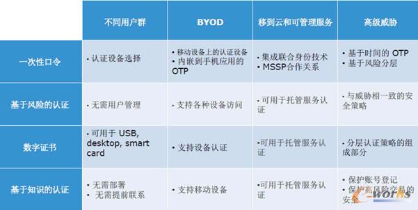 可見,新時(shí)期的身份認(rèn)證,需要針對(duì)于不同的用戶的群體采取不同的認(rèn)證方式。馮顧問列舉這些不同群體就包括內(nèi)部的員工、臨時(shí)工、合同工、合作伙伴、客戶、審計(jì)人員,還有遠(yuǎn)程需要接入的員工等等,這些用戶需要在任何的時(shí)間從任何的地方(比如在家里、出差的時(shí)候)使用任意設(shè)備(包括傳統(tǒng)的筆記本、臺(tái)式機(jī)或者是ipad等各種移動(dòng)設(shè)備)通過這些設(shè)備來進(jìn)行安全的訪問。