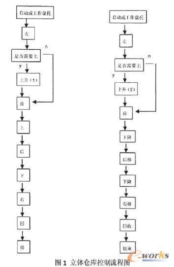 (4)移庫動作:把三維庫中的工件從一個庫位移到另一個指定庫位,機械手通過直流電機控制左右、上下、前后移動控制流程圖如圖1。