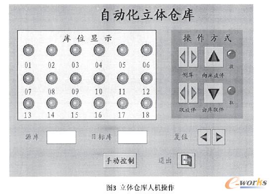 根據立體倉庫控制程序和操作要求,設計人機操作界面,使之完成立體倉庫的所有功能,包括取件、放件和移庫等操作,并能實時監測庫位存放J=件的狀態。經過設計生成的畫面如圖3所示。