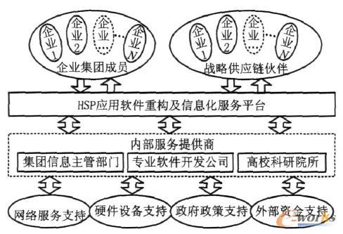 (2) 應用服務層 應用服務層是HSPs的支撐層,該層又可以分為HSPs信息化服務平臺層和應用服務器層。HSPs信息化服務平臺層主要為企業提供可重構的應用軟件和應用軟件的運行、維護環境,以及相關的信息化服務;應用服務器層是用于開發、配置和管理大規模應用系統的中間件平臺,同時也具有確保將這些應用系統與原有系統、數據進行集成的能力。