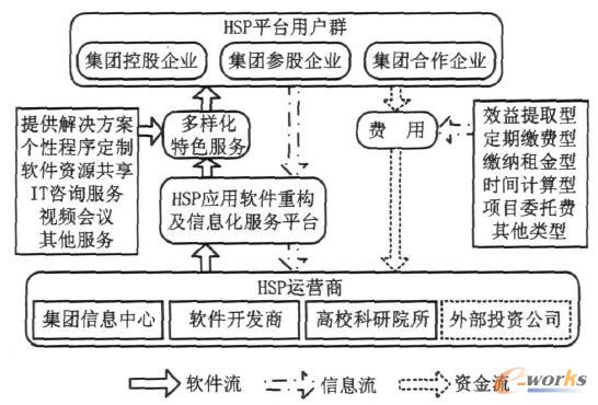 HSPs的運營模式如圖1所示。HSPs模式的主要支撐部分是內部服務提供商(HomeServiceProvider,HSP)和由其運營的應用軟件重構及信息化服務平臺。HSP由集團信息主管部門、專業軟件開發公司和高校科研院所等三家單位組成,以股份有限公司的形式存在和運行,三家單位按比例參股,享受股東權利,執行股東義務。集團信息主管部門控制51%以上的股份,負責公司的日常運營工作,直接受集團公司董事會領導,對總經理負責。HSP通過應用軟件重構及信息化服務平臺,為企業用戶提供業務規劃,信息規劃,信息系統的構建、重構、集成,系統的實施和維護等面向企業信息化生命周期的全程服務。