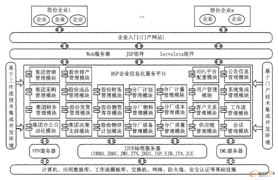 (1)應用門戶層 該層是企業進入HSPs的接入層,企業根據HSP分配的用戶名和密碼登錄服務平臺,選擇適合本企業的服務。HSP主要服務的對象是企業集團成員,即子公司、控股公司、參股公司。為滿足各類用戶的需求,允許用戶以多種形式接入實體,如固定PC機和移動PC機、工作站、PDA(per sonal digital assistant) 等。
