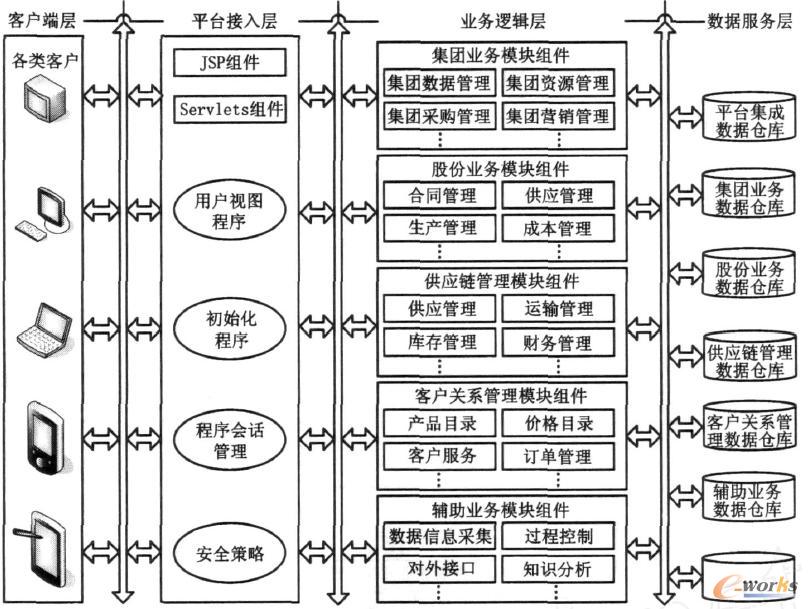 (3) 業務邏輯層 業務邏輯層是平臺的核心,實現應用系統所有主要的業務邏輯。業務邏輯組件是根據現實業務抽象出一個個獨立的業務活動對象,主要包括集團業務模塊、股份業務模塊、供應鏈管理模塊、客戶關系管理模塊、供應關系管理模塊等。業務邏輯層對具體業務進行封裝,以便公用。定義完善的對外接口使每個業務組件相對獨立,對某個業務進行修改和新增業務組件不會影響整個系統架構。