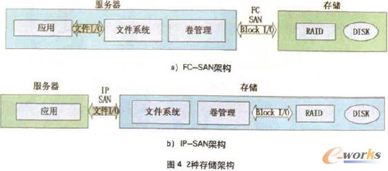 從圖4中可以看出,在FC-SAN架構中,文件流存在于應用系統和文件系統之間,文件系統和卷管理進行交互,卷管理和存儲之間進行塊傳送,存儲設備包含獨立冗余磁盤陣列(RAID)和磁盤。在IP-SAN架構中,基本的組成元素和FC-SAN是一樣的,但是應用系統和獨立于服務器之外的文件系統交互文件流,塊傳送因而也在存儲設備內部發生,由此可見IP-SA N降低了服務器端的復雜度。它建立在常見和穩定的工業標準上.對IP技術熟悉的人員可以很容易接受和實施,因而減少了聘請專業人員的成本。同時,它還減少了網絡數量、降低了布線復雜度,并且可以使用常規以太網交換機而不必專門采購光纖交換機,很大程度提高了互操作性,降低了投資。使用IP-SAN架構使得數據傳播更為便捷,可以在全球IP網絡上進行以太網傳輸,實際傳播距離不會受到任何限制。