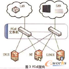 以太網光纖信道(FCoE)是INCITS T11開發的一項新標準。FCoE協議獨立于以太網轉發模式,并在以太網上映射本地光纖信道。FCoE保留了所有的光纖信道結構,保持與光纖信道相同的時延、安全性和流量管理特征,因此可以通過循序漸進的方法向I/O端口整合的趨勢演進。