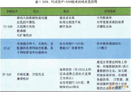 SAN、FcoE及IP-SAN 3種存儲技術的各自持點及應用如表1所示。