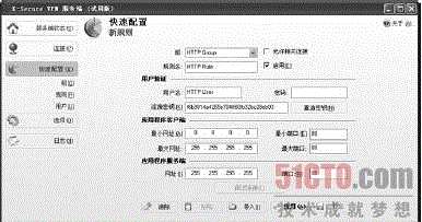 K-Secure VPN 是通過規(guī)則控制網(wǎng)絡(luò)連接的,在窗口左側(cè)單擊“快速配置”按鈕,在右側(cè)窗口(如圖4 所示)的“組”欄中輸入或者選擇規(guī)則組的名稱(如“HTTP Group”),在“規(guī)則名”欄中輸入規(guī)則的名稱(如“Http Rule”)。選擇“啟用”項(xiàng),表示激活本規(guī)則。在“用戶名”欄中輸入用戶名稱(如“HTTP User”),只有指定的用戶才可以使用該規(guī)則。