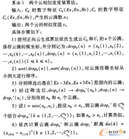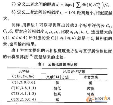 本文方法的主要目的在于:根據當前系統變量值,直接感知出系統的安全風險,以正確評估風險。根據實際采集到的樣本值,計算此時的C(Ex,En,He)和云模型,然后根據下面的云相似度算法(算法1),計算此云與已知概念云的相似度,相似度最高的即作為輸出。算法1通過產生一定數量的云滴,基于云滴之間的距離來度量云的相似度。