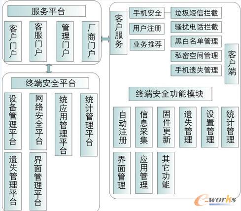 (2)終端安全平臺,包括:設備管理平臺、網絡安全平臺、應用管理平臺、統計管理平臺、遺失管理平臺和界面管理平臺等業務實現平臺,是整體安全功能的實現平臺,與客戶端配合實現各項功能。