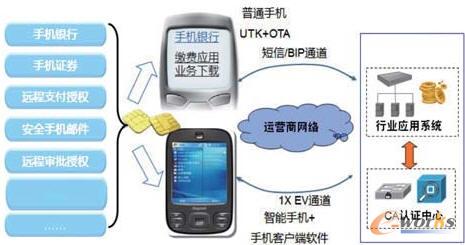 終端使用的用戶卡是全球唯一的,每張卡僅對應一個用戶,所以用戶卡可以成為終端用戶天然的身份識別工具。可以通過用戶卡卡號識別用戶身份,并且可以利用用戶卡存儲用戶的銀行帳號、數字證書等標識用戶身份的有效憑證。不僅如此,用戶卡還可以用來實現加密算法、數字簽名、公鑰認證等移動支付領域必備的安全手段。由于用戶卡是可控并且安全的,所以可以基于用戶卡為移動支付等業務提供安全平臺,解決移動支付等業務應用過程中的一系列安全問題,如圖4所示。
