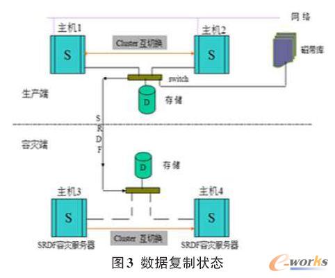1)復(fù)制狀態(tài),平時生產(chǎn)端數(shù)據(jù)實時更新到容災(zāi)端,容災(zāi)數(shù)據(jù)盤處于寫狀態(tài),生產(chǎn)數(shù)據(jù)處于異地保護(hù)之中,此時容災(zāi)端主機無法訪問容災(zāi)數(shù)據(jù)盤,容災(zāi)數(shù)據(jù)不可讀。如圖3。