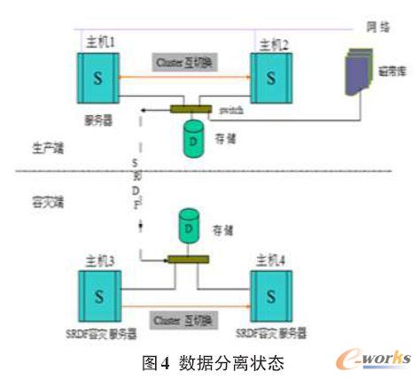 2)分離狀態(tài),容災(zāi)數(shù)據(jù)演練、驗證時,生產(chǎn)端數(shù)據(jù)停止復(fù)制,與容災(zāi)端分離,此時容災(zāi)端主機可訪問數(shù)據(jù)盤,即容災(zāi)數(shù)據(jù)可讀寫。容災(zāi)和生產(chǎn)是兩個獨立的系統(tǒng),容災(zāi)數(shù)據(jù)的讀寫均不會影響生產(chǎn)端數(shù)據(jù)。當(dāng)然此狀態(tài)下,生產(chǎn)端數(shù)據(jù)是無保護(hù)的,所以分離狀態(tài)的時間要盡可能的短。如圖4。