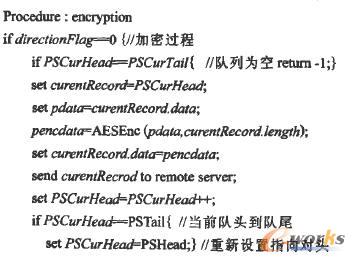 在網絡上傳輸的數據和RBC存儲的鏡像數據都是經AES加密算法加密的密文,只有LBC存儲的是明文,加密發生在從LBC讀出數據封裝成備份記錄的過程中,而解密是在恢復過程中將從網絡接收到的備份記錄中的密文解密得到明文。在系統海量緩存中維護著兩個隊列,一個是讀出發送隊列SQuene,用于存儲有效數據為明文的備份記錄,需要加密后通過網絡通信模塊發送到災備中心,另一個是接收隊列RQuene,用于存儲從災備中心接收到的備份記錄,其中有效數據是密文,需要解密后根據任務對應盤符、磁盤偏移off寫入磁盤,這兩個隊列共享海量緩存空間,都是單循環隊列,系統為每個隊列維護著兩個指針PCurHead、PCurTail,分別指向隊列的頭和尾,隊列為空的條件為PCurHead—PCurTail。算法描述如下: