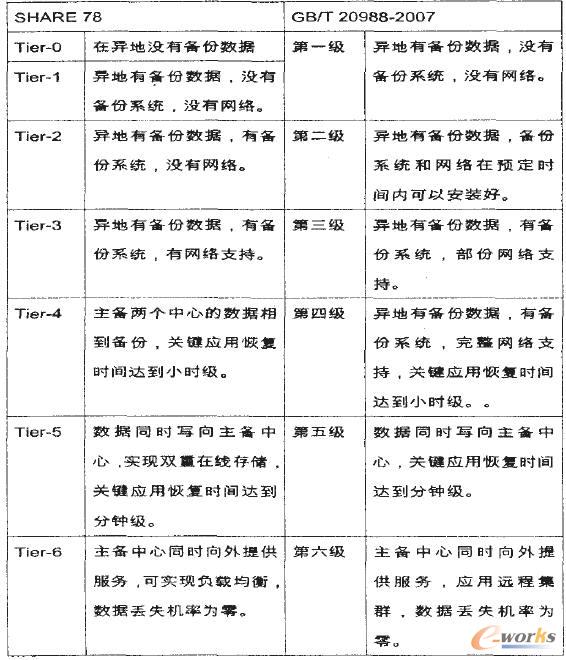 SHARE 78將數據中心容災與備份系統的安全等級分為七級,我國的國家標準則將數據中心容災與備份系統的安全等級分為六級,他們的對應關系如表1。