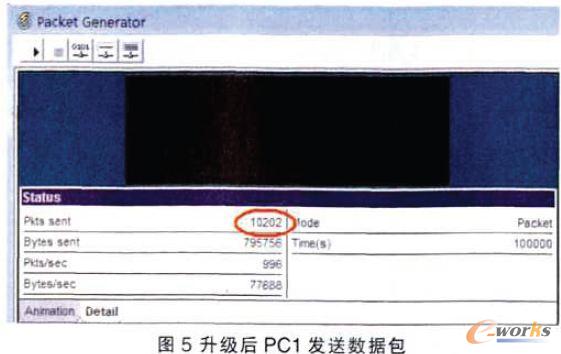 第2次使用物理端口設(shè)置IP地址、將SW1和SW2之間OSFP路由COST值調(diào)高到20,采用點(diǎn)到點(diǎn)類型。hello間隔由10s調(diào)整到1s,默認(rèn)路由為鏈路A,斷開SW5-SW6之間鏈路后路由自動切換到鏈路B,再恢復(fù)SW5-SW6之間的鏈路,通過Sniffer發(fā)包(每s發(fā)送1000個包)。觀察路由恢復(fù)到鏈路A的時間,期間PC1發(fā)送10202個包,PC2收到9909個包,包大小為74個字節(jié),發(fā)送和接收包數(shù)址相差293個,經(jīng)過計算,路由恢復(fù)時間約0.293s,ping沒有丟包現(xiàn)象,測試截圖如圖5和圖6所示。