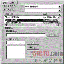 首先,切換進入DHCP 服務器的控制界面,展開該界面左側子窗格中的目標主機選項,右擊“作用域選項”,選擇右鍵菜單中的“配置選項”命令,繼續選擇彈出界面中的“高級”選項卡,打開高級選項設置頁面,如圖2所示。