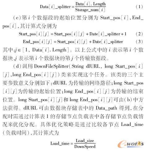 (b)從數(shù)據(jù)塊存儲(chǔ)表中依次讀取模板文件的各數(shù)據(jù)塊的Data_path[i]、Storage_num[i](i∈[1,Data_num])。同時(shí),應(yīng)用HttpURLConnection.getHeaderField(sHeader)函數(shù)獲得該數(shù)據(jù)塊大小Data[i].Length。將該數(shù)據(jù)塊分為Storage_num[i]個(gè)部分。為區(qū)別之前提到的數(shù)據(jù)塊,本文將這Storage_num[i]個(gè)部分叫做傳輸數(shù)據(jù)段。這些數(shù)據(jù)段的大小為Data_splitter,計(jì)算方法為
