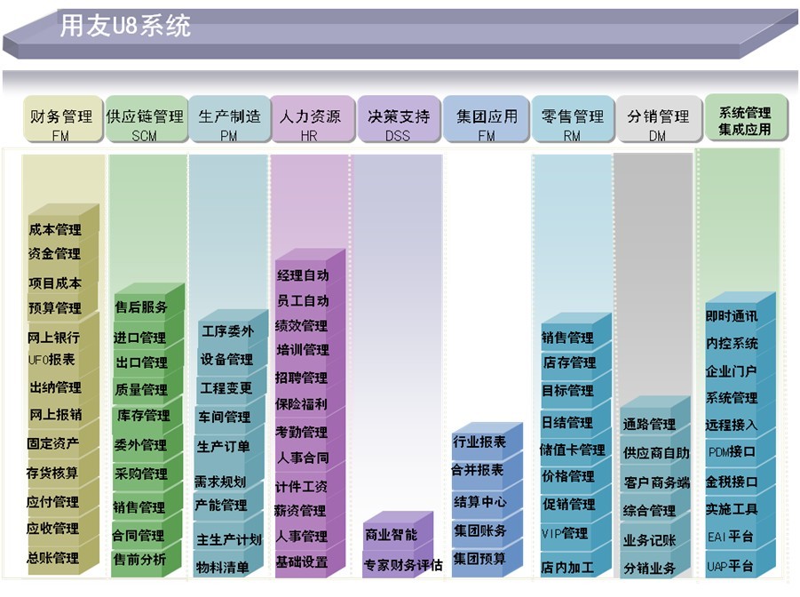 用友ERP—U8提供財務管理、供應鏈管理、生產(chǎn)制造管理、客戶關系管理、人力資源管理、辦公自動化和商業(yè)智能等集成化功能,并整合各種合作伙伴的方案。在總結(jié)中國企業(yè)各行業(yè)最佳實踐的基礎上,提供的行業(yè)解決方案涵蓋機械、電子、汽配、服裝、化工、食品、制藥、服務業(yè)、零售業(yè)等,是中國企業(yè)應用最廣泛的ERP管理軟件。